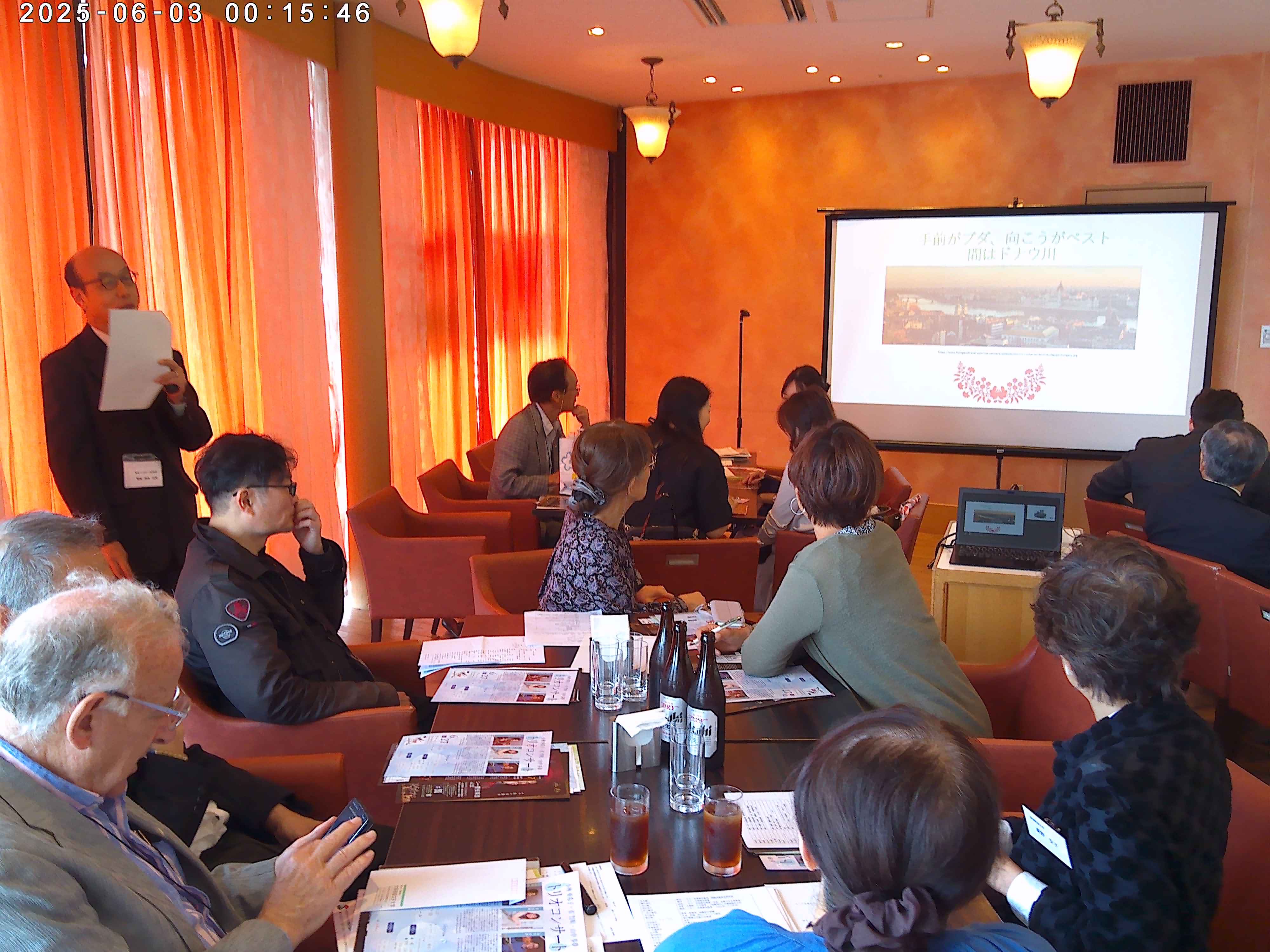 その後は、昼食会。お食事をしながら話が弾んでいました。食事後は、今年度は日本ハンガリー友好140周年記念ということもあり、東京在住の会員伊能さんからハンガリーのホーロック村と日本の飛騨白川郷との友好関係のプロジェクトの話があり、二つの村は世界遺産でもあり、人口減少村でもあるという共通点に共感して、関西ハンガリー交流協会主催でいろいろと取り組みことが承認されました。